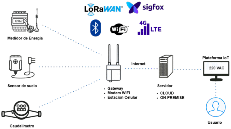 Integramos sensores, controladores y gateway con tecnologías inalámbricas como Wi-Fi, Bluetooh, LoRaWAN, Sigfox , redes celulares (2G/3G/4G/5G) y satelitales para desarrollar soluciones IoT.Nuestra infraestructura, basada en redes LPWAN y plataformas IoT ( en la nube y on-premise ), permite ofrecer soluciones IoT completas, robustas y eficientes, que optimizan procesos, reducen costos y mejoran la productividad en diversos sectores industriales.